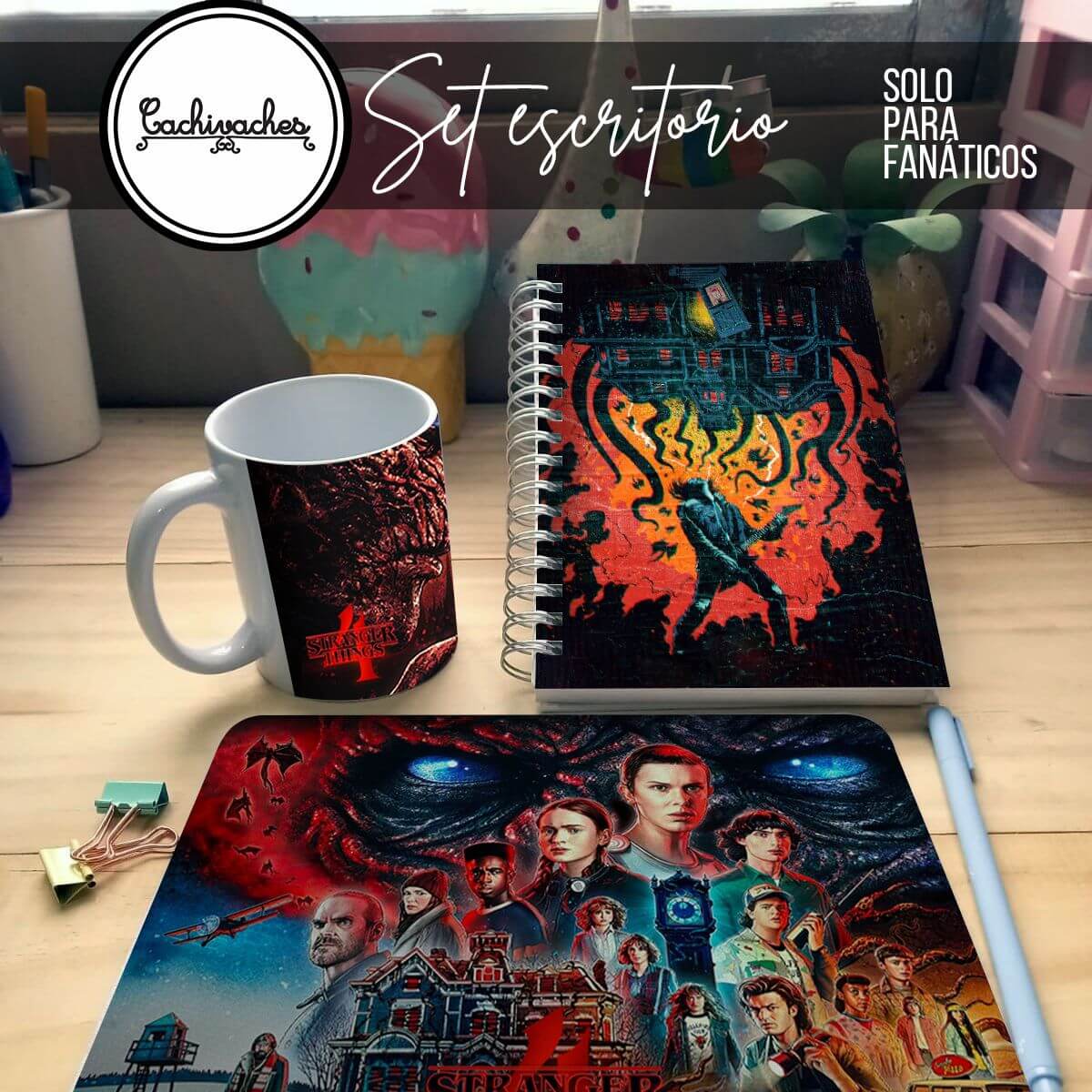 Set de escritorio temático Stranger Things con diseño llamativo y moderno. Ideal para niños y niñas fanáticos de la serie. Personalizable con nombre en taza y cuaderno.